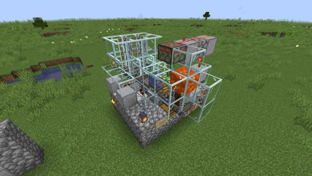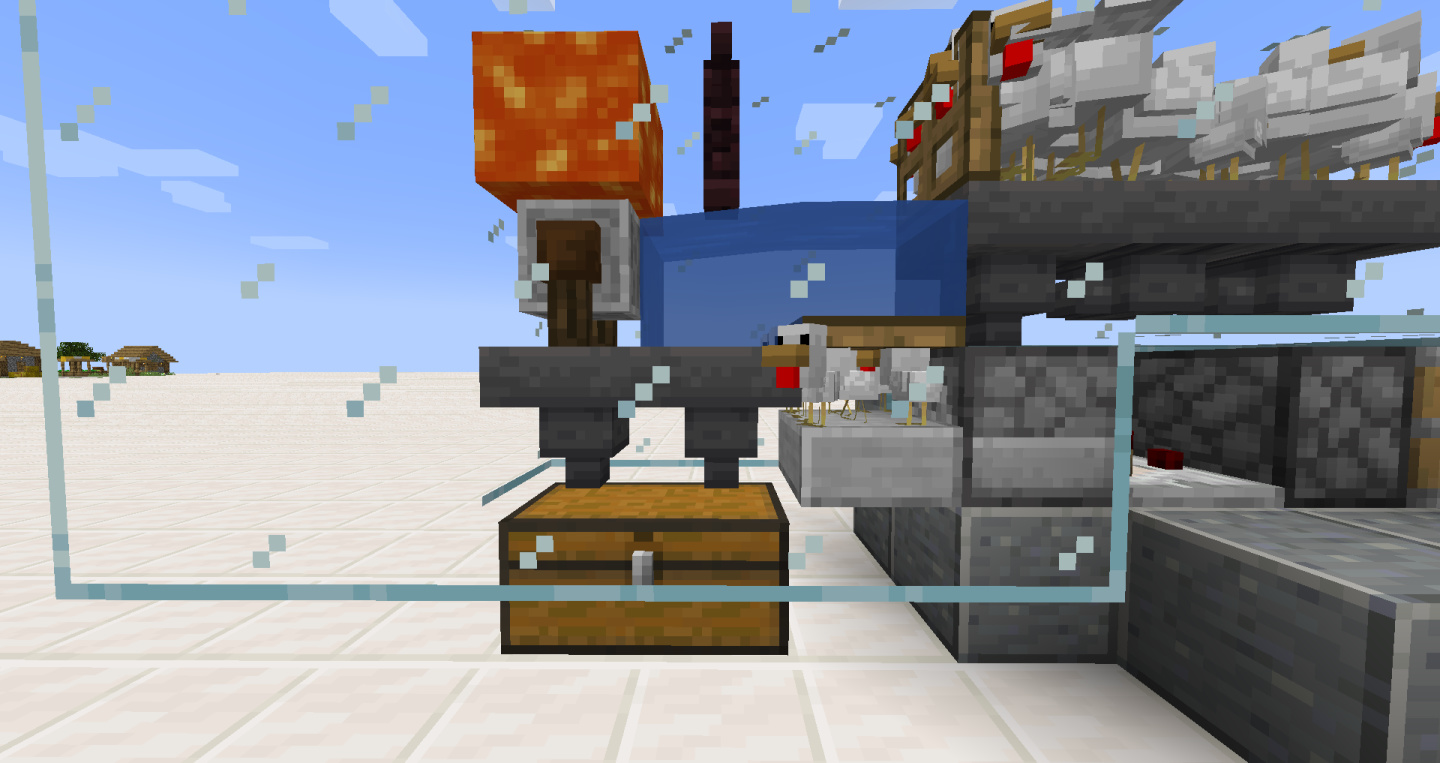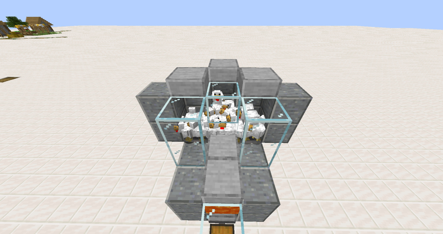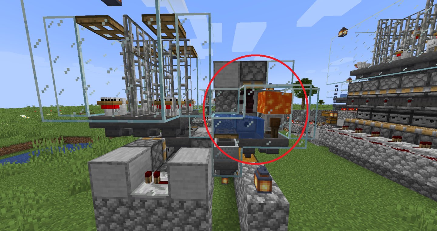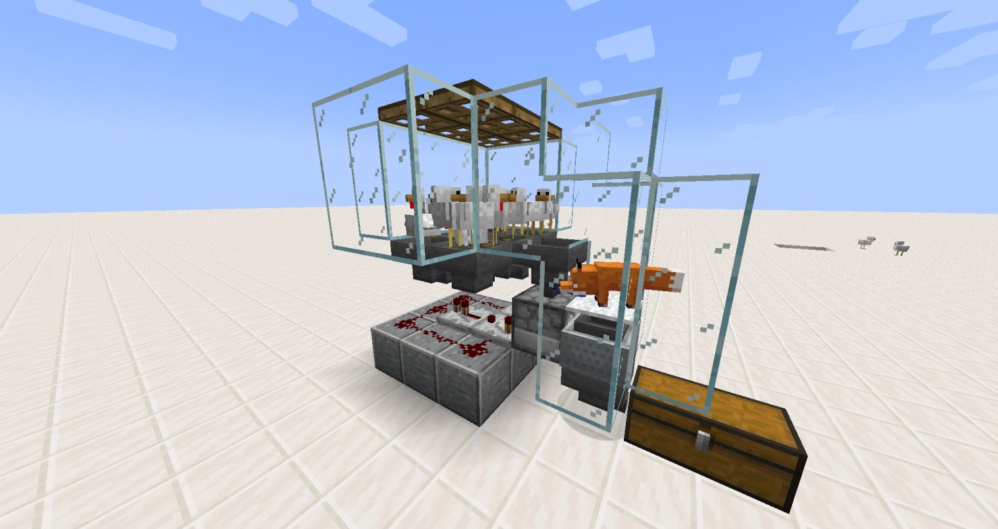 成年鸡会不定时下蛋,蛋收集到发射器内,感应电路检测到会激活发射器发射鸡蛋,在岩浆下方生成小鸡,小鸡长大后接触到上方岩浆,死亡后掉落熟鸡肉和羽毛。