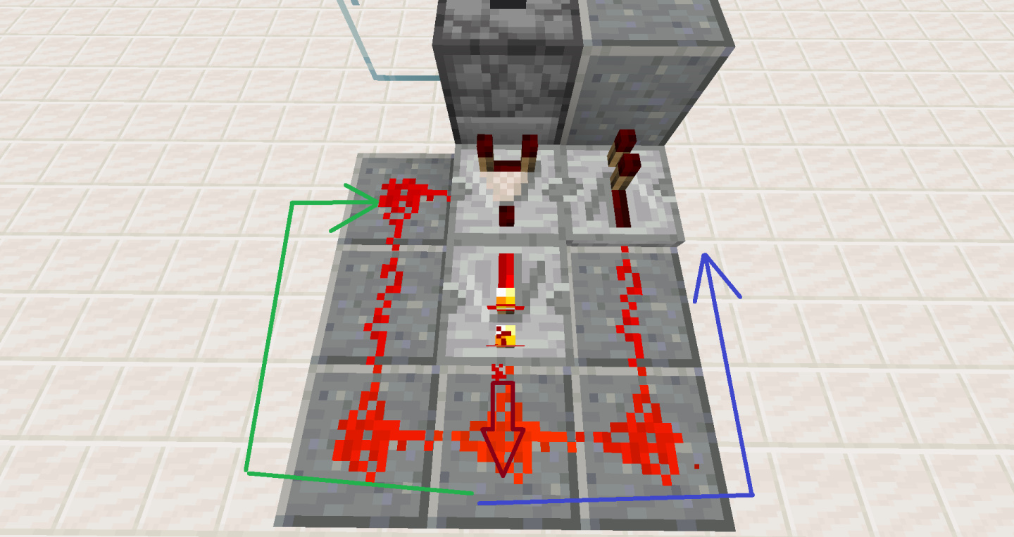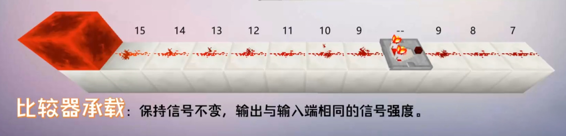 紧接着下图,输出为1强度的红石信号后,经过红石中继器,再次输出的红石信号变为满格15强度,并且向两个方向的红石线分别传递。