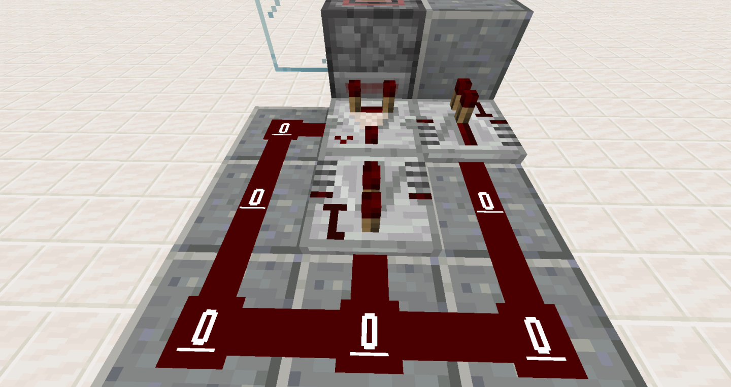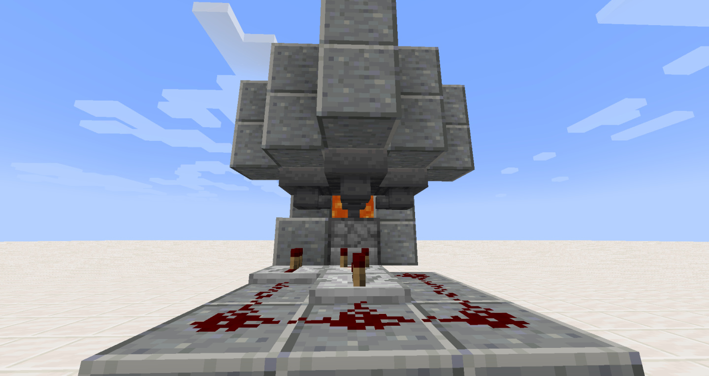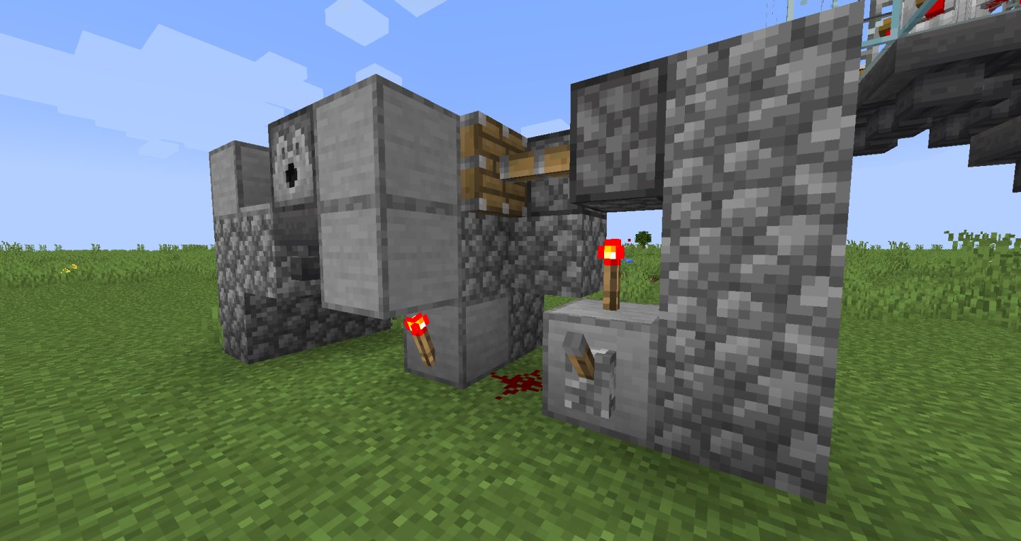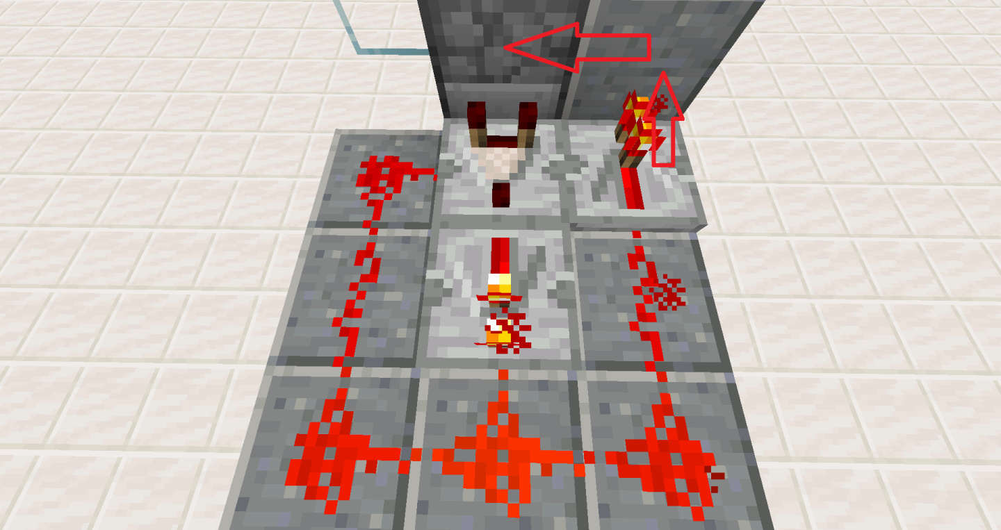整个脉冲电路平面的左下方就是上面提到的鸡蛋处理的决定装置,如果拉下这里的拉杆,那么这里的红石火把将会熄灭,上方的黏性活塞将收回侦测器,造成脉冲电路无法工作,进而阻止发射器工作。