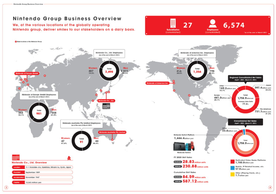 截止到2021年3月,任天堂有27家子公司和6574 名员工