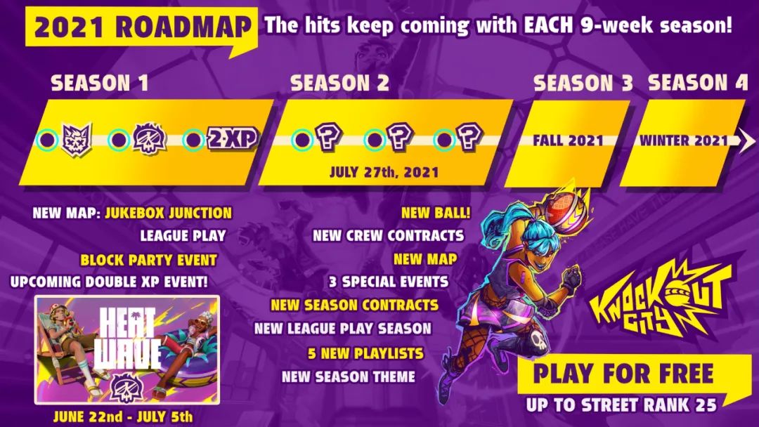 EA发行的躲避球题材PVP游戏《Knockout City》将在7月27日开始第二赛季,官方现带来了第二赛季的线路图预告: