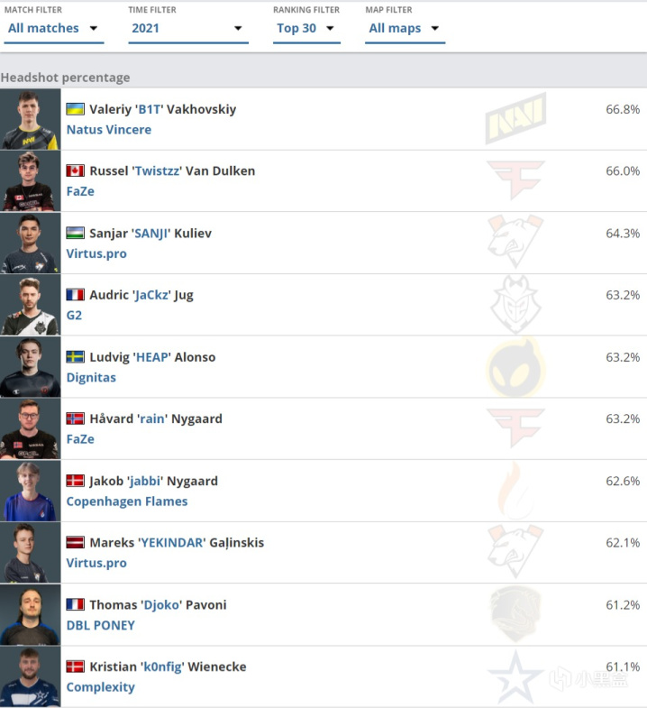 在打完StarLadder CIS RMR 2021小组赛之后,B1T在2021年所有赛事的爆头率来到了66.8%,超过TwistZz的66%。第三名是Virtus.pro的SANJI,他的爆头率是64.3%。前五还有G2的JackZ和Dignitas的HEAPS,FaZe选手Rain以63.2%的爆头率并列第四。