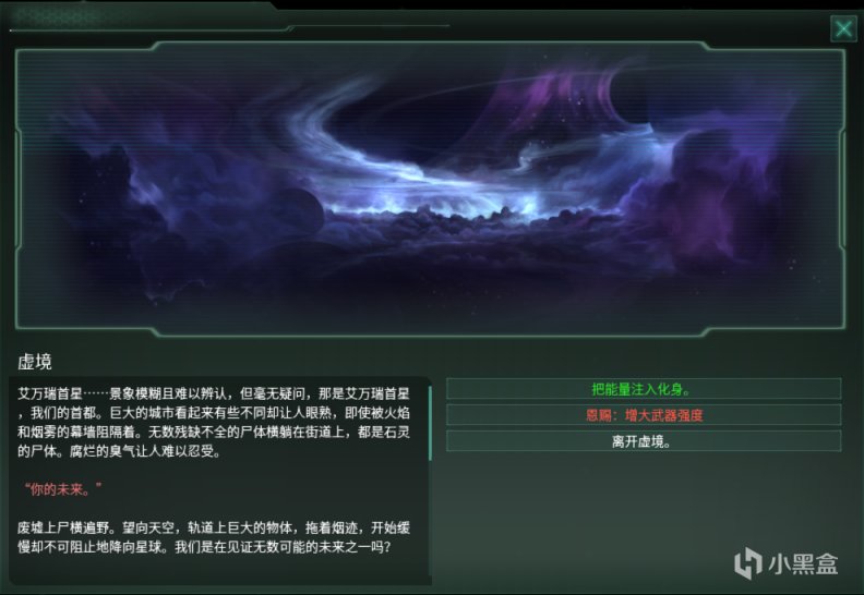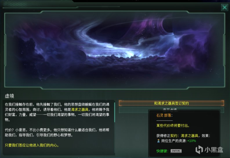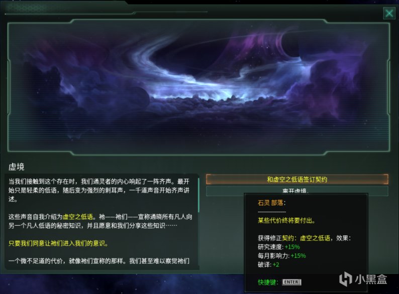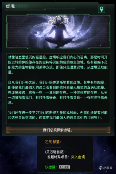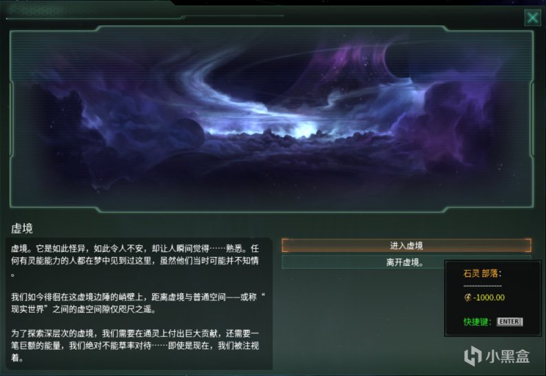 完成特殊项目:突入虚境后,帝国将获得与灵能界交流的能力,可以花费1000点能量币进入虚境,与虚境之中的存在进行交流,获取各种不同的buff。