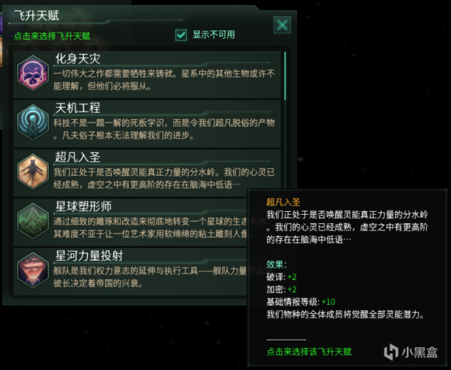 “超凡入圣”天赋需要在第三个飞升槽位开启后才能选择。