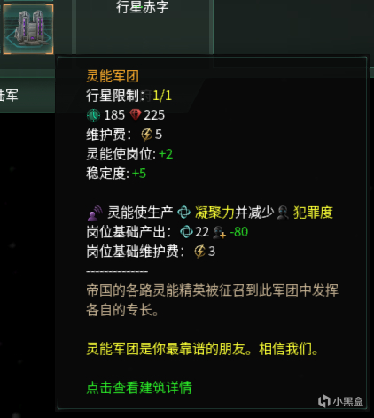 灵能军团建筑拥有强力的增加行星稳定度、减少犯罪度的效果,还能为行星增加陆军防御部队,产生凝聚力,属于唯心主义帝国特有的强力建筑。