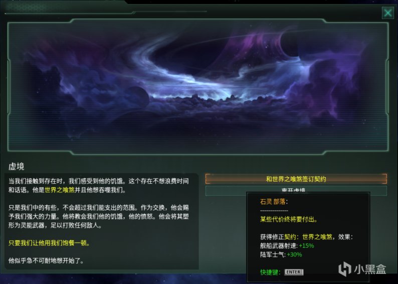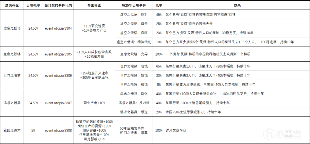 在未签订任何契约的情况下,帝国在进入虚境时有15%的几率遇到“古老而强大的存在”,触发事件,事件代码为event utopia.3300