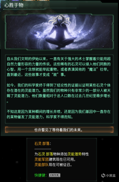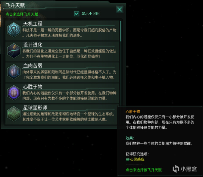 要触发轮回之终末事件,首先需要帝国完成灵能飞升路线,选择飞升天赋“心胜于物”—“超凡入圣”,“心胜于物”飞升天赋需要在第二个飞升槽位开启后才能选择,并且需要完成科技:灵能理论。