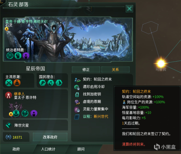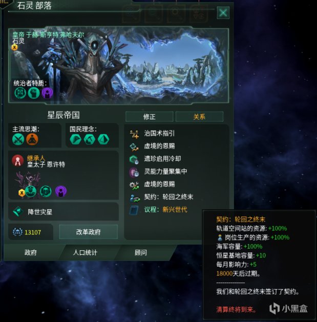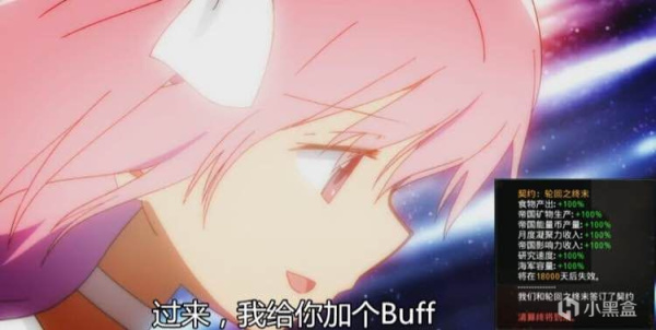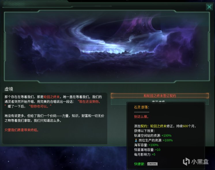 在签订契约:轮回之终末后,帝国将获得一个持续50年的超强力的buff,简单来说就是资源产量翻倍,舰队容量翻倍,恒星基地容量+10,每月影响力+5。在此buff加成下,帝国的发展速度将会大大加快(不只是翻倍这么简单),由于产量提升带来的人口消耗品冗余,也会让人口出现爆发式增长,舰队实力也会获得极大提高(也不只是翻倍这么简单),打起架来那是谁都不怕。