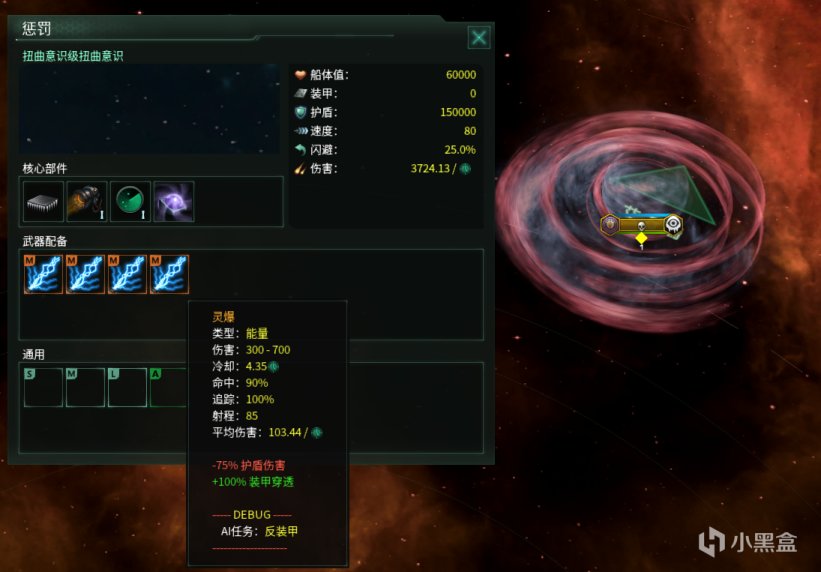 在防御方面,扭曲意识只有护盾作为外部防御,但是同样拥有高额的船体值加成。在武器配置方面,扭曲意识的火力堪称丧心病狂,装备的武器“灵爆”射程中等,拥有变态的100%追踪属性,这意味着护卫舰的高闪避(90%)优势在面对扭曲意识时也起不到多大作用;而在武器方面,在最顶级的5000人口加成情况下,“灵爆”会拥有+600%伤害及+600%武器射速的逆天buff,群星中的计算方式非常简单,在这种buff下的“灵爆”会具有高达49倍的理论伤害,每个武器的单发伤害达到2100~4900,射速为0.62/天,实战效果大概就是:单个武器一发一艘护卫舰,4个武器齐射一轮秒掉一艘战列舰,搭配上夸张的射速,不需要一个月就能灭掉一支标准的T34舰队(10护卫30战列)。