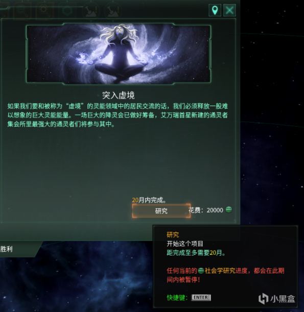 完成灵能飞升路线3个月后,在帝国母星上将会触发事件“虚境”,发起特殊项目:突入虚境,需要花费20000点社会学研究点数,完成时间依据帝国内社会学研究点数产出计算。