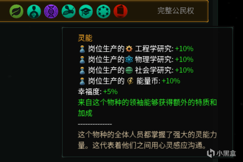 开启后帝国内所有物种(包括游戏开始后加入的,不包括难民和正在净化的物种)获得特质“灵能”,拥有科学研究点数产出+10%、能量币产出+10%、幸福度+5%的强力buff,并且拥有“灵能”特质的领袖会根据职位不同获得对应的buff。另外,帝国内还会有一位领袖被选为“天选之人”,“天选之人”拥有比“灵能”更加强力的buff,“天选之人”固定为帝国领导位置的继承人。