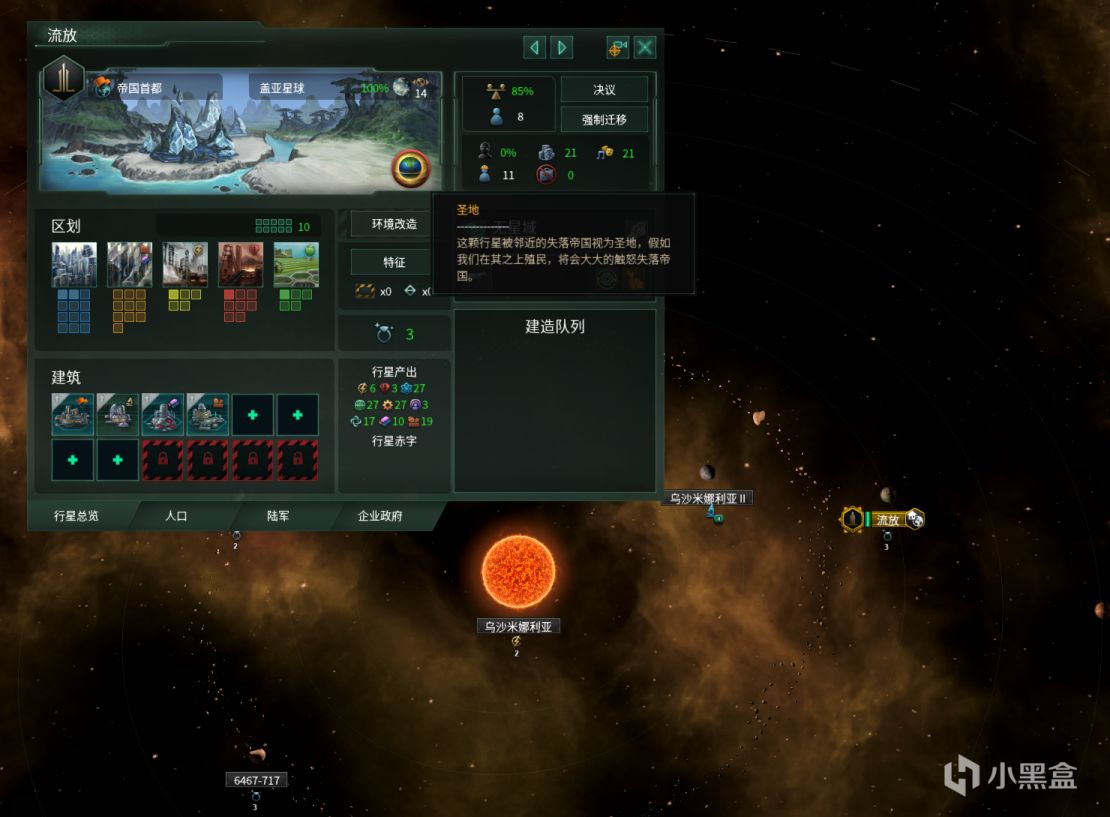 2.帝国将选择一颗帝国范围外离原首都最近的可殖民星球作为流放星球,优先选择不被任何国家控制的星系,流放星球将拥有初始的4个区划及8个人口。