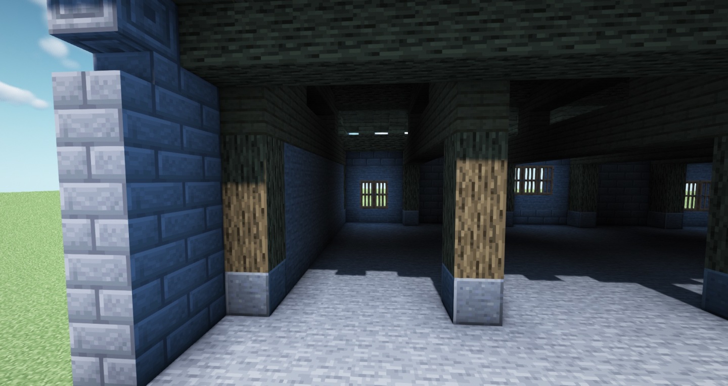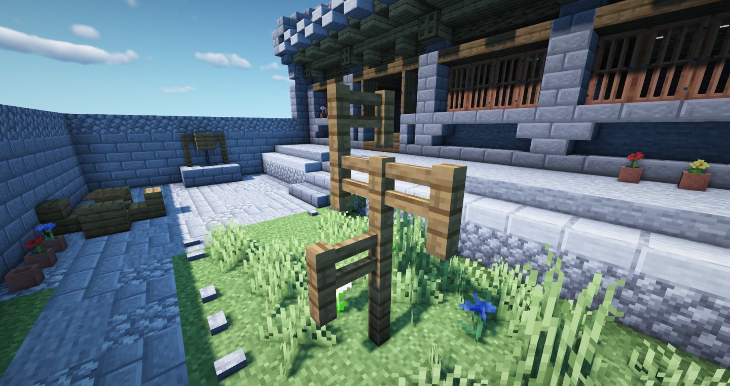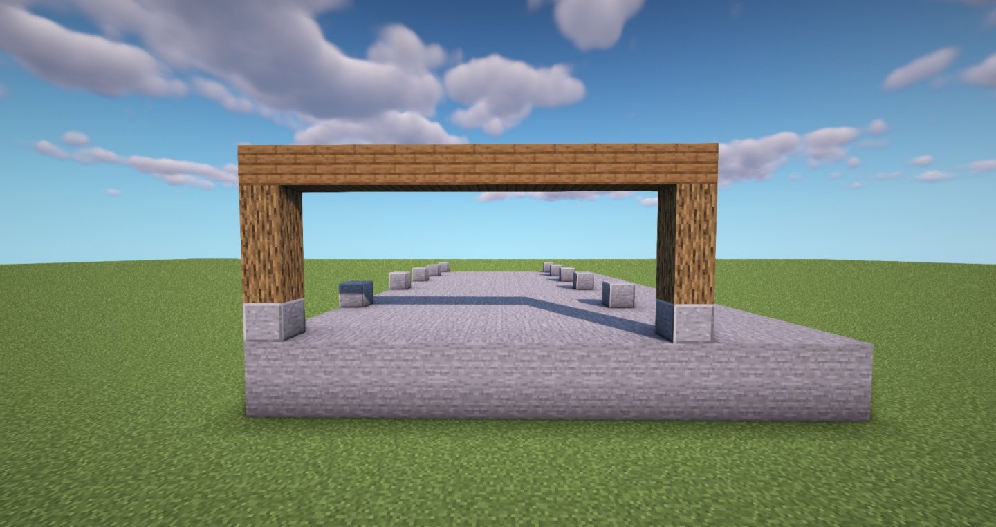 下图,我们继续丰富层次,在原来木质柱子前添加石砖,以及内侧的石头封墙,都是继续用整体建筑相关的建材和色调。