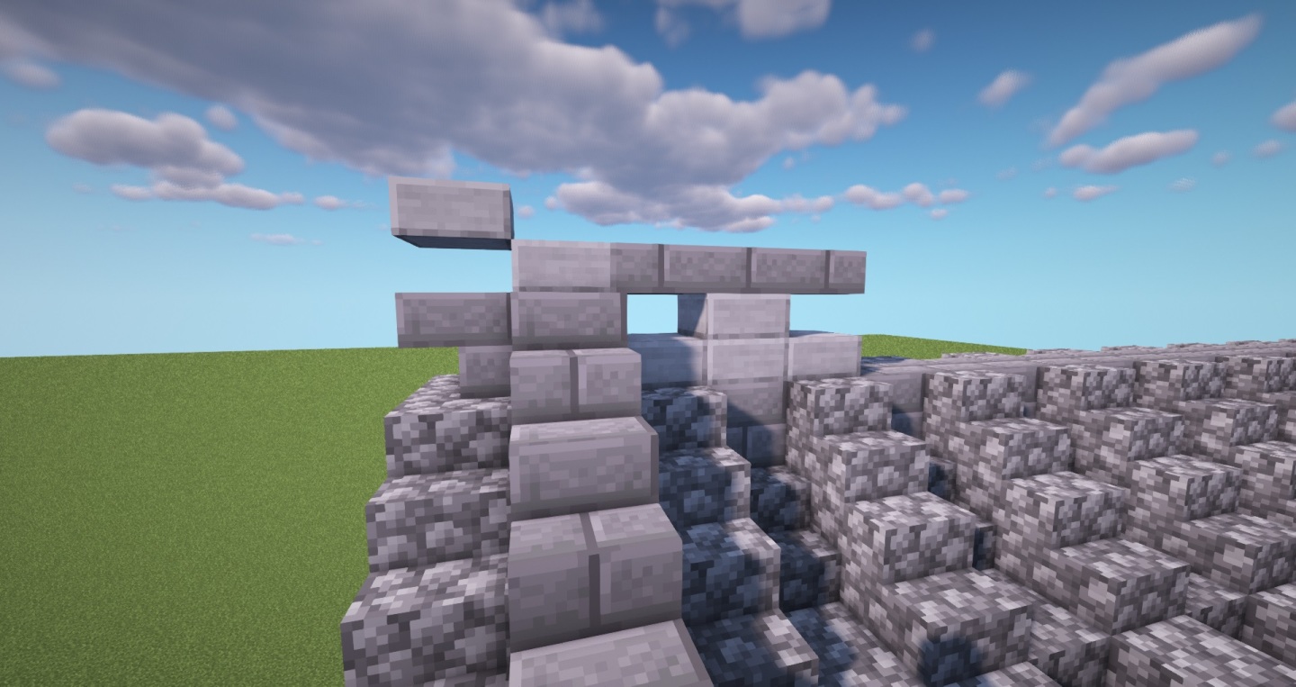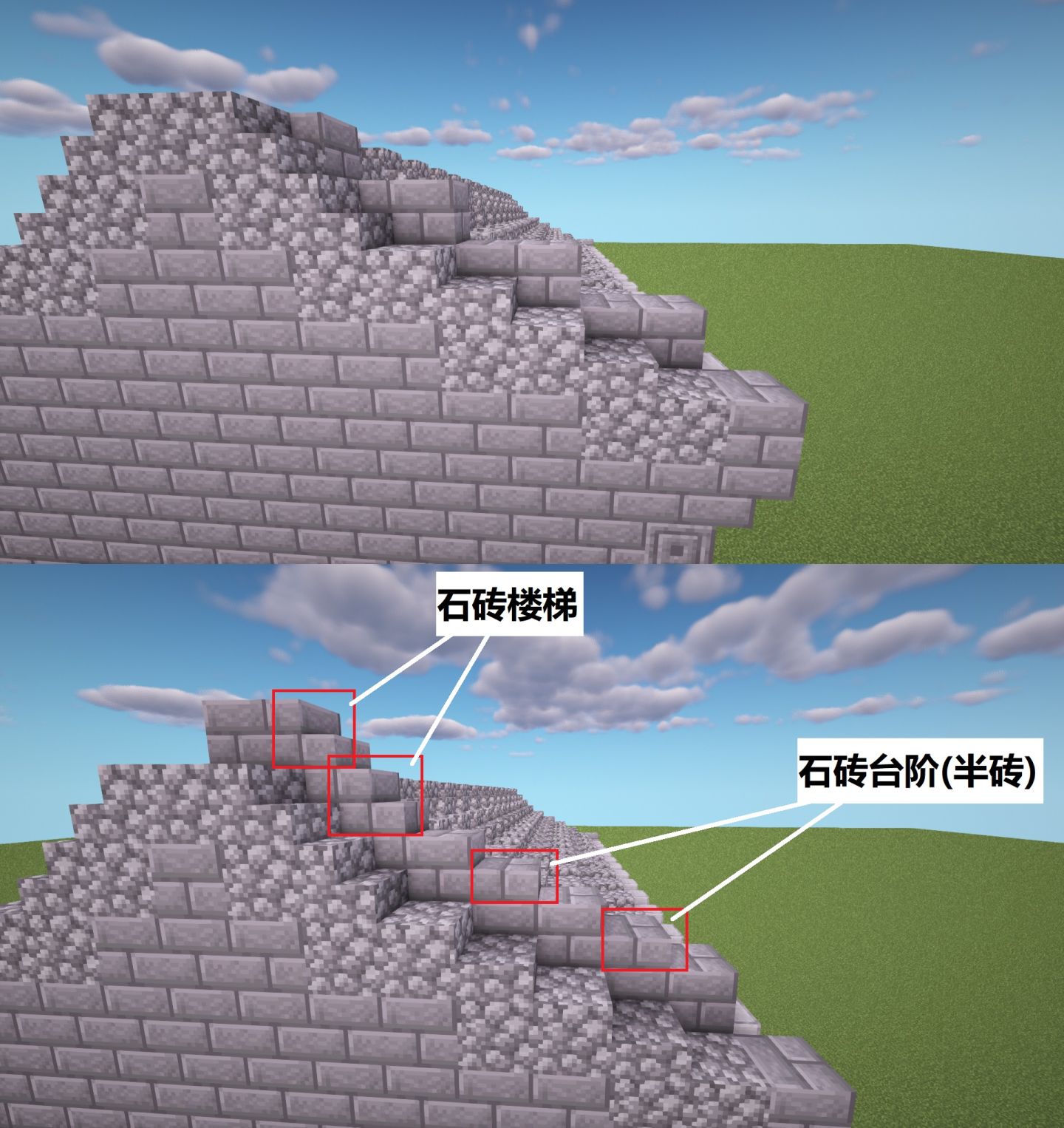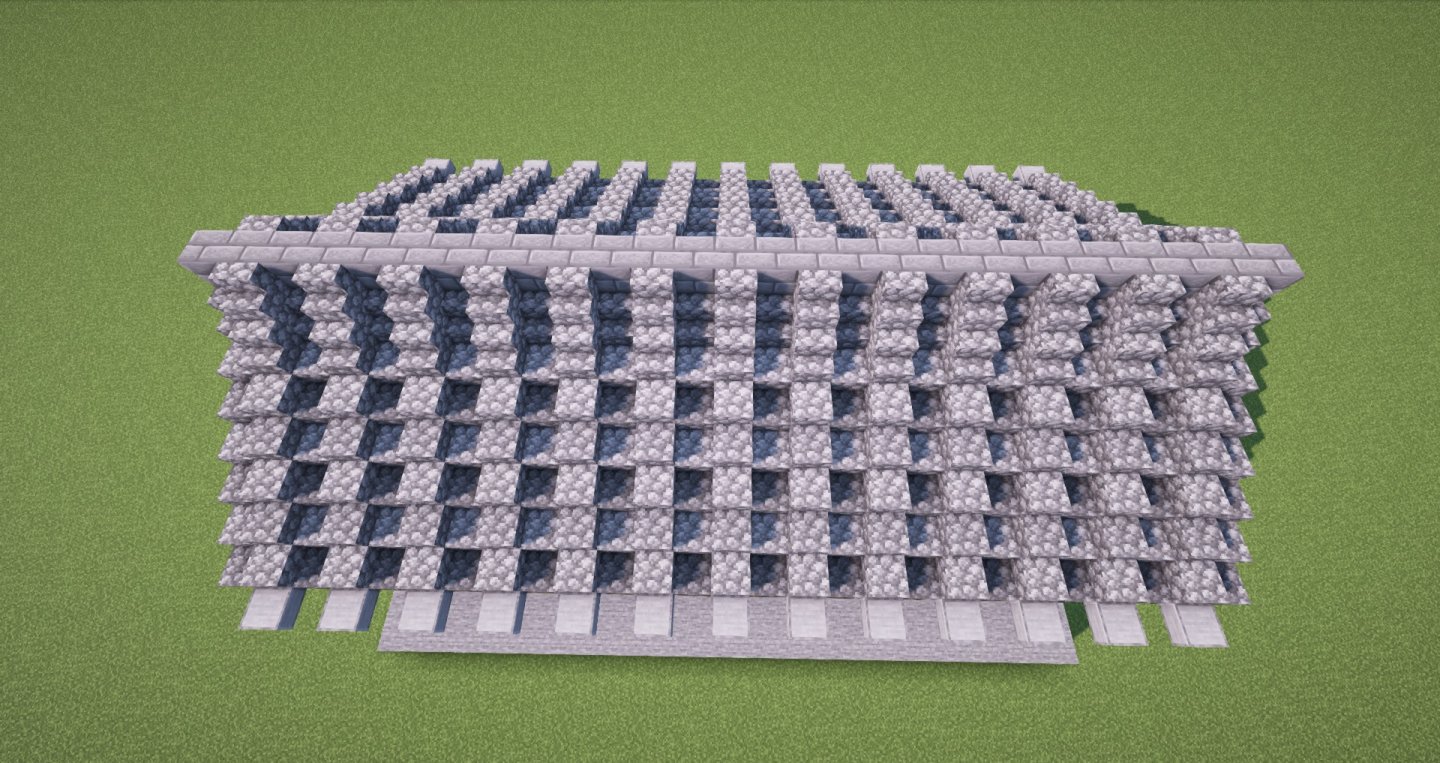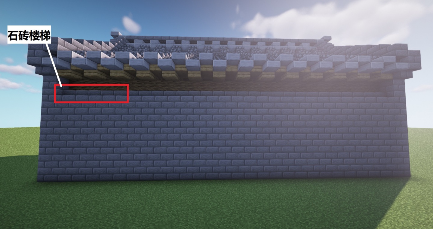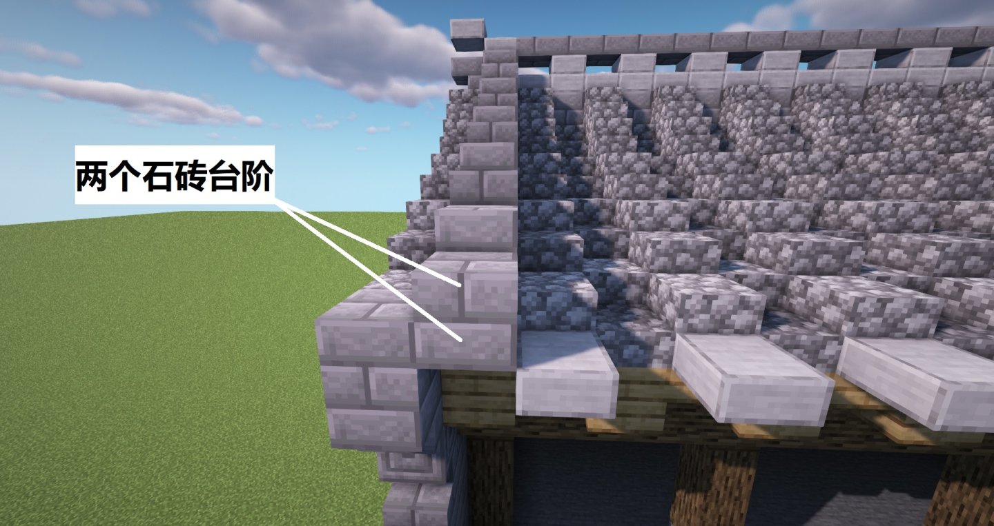 继续将相邻一列瓦片改成两格高的石砖,再用石砖台阶和石砖楼梯进行层次丰富,对称方向和另一侧也如是。