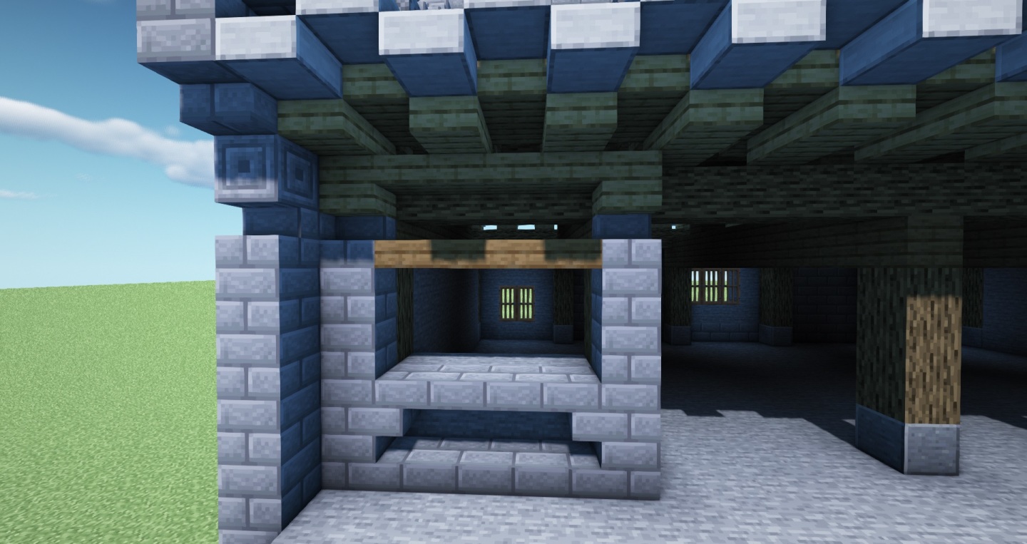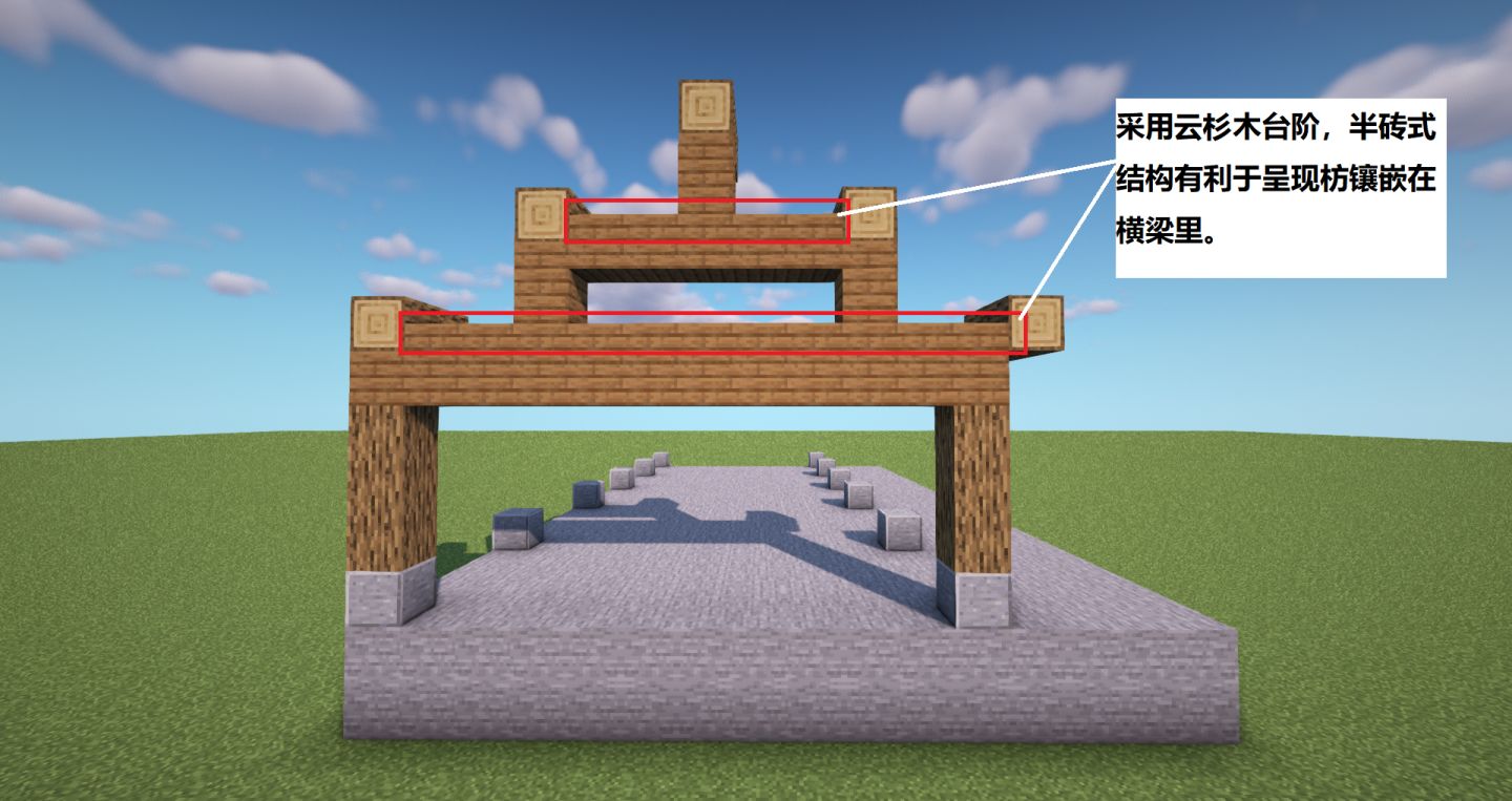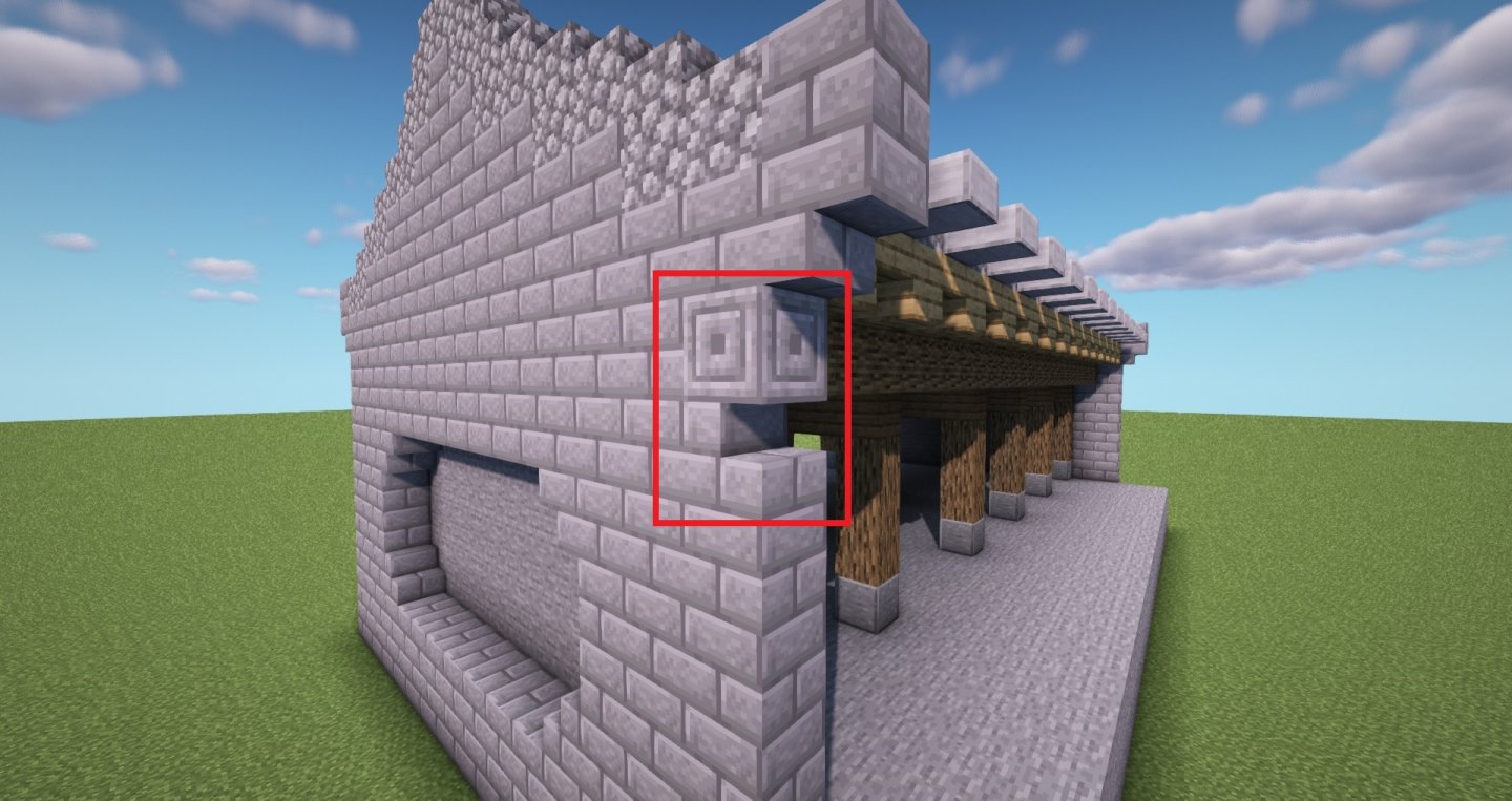 下图,对于柱我们采用底部磨制安山岩+橡木原木,磨制安山岩代表的就是防水、防潮作用——在主柱与地基间建有的柱础,而柱础上的雕花暂时无法还原。