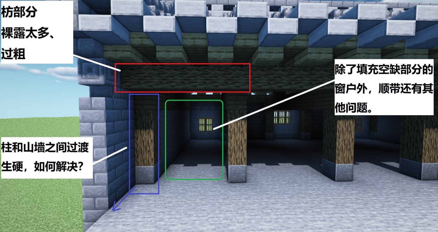 柱部分和山墙,隔了两格远未免过于生硬,这些都是肉眼可见的部分,而我相信真正实际建造的时候大家都会着手解决并丰富这几个地方。