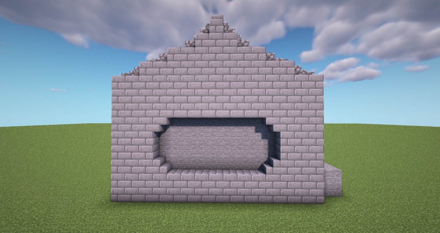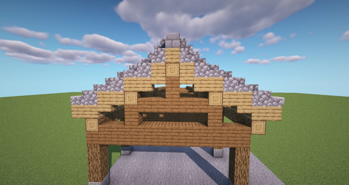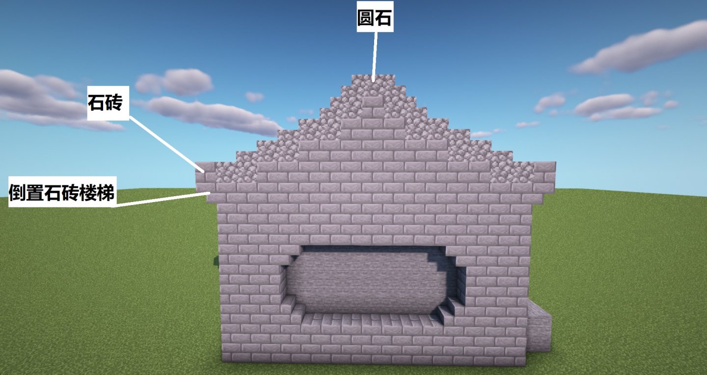 接下来要进行山墙旁的垂脊,首先延伸檐角,使用圆石抬高和完善山墙。