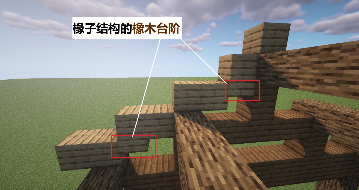 通过石砖台阶和楼梯搭配,增添常见中式结构,原木的枋部位往后退一格,使用橡木台阶添加出了第三层次。