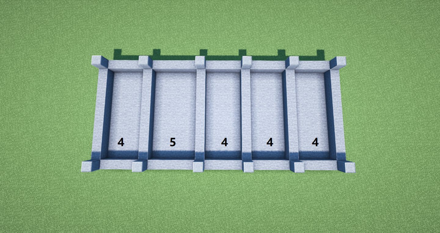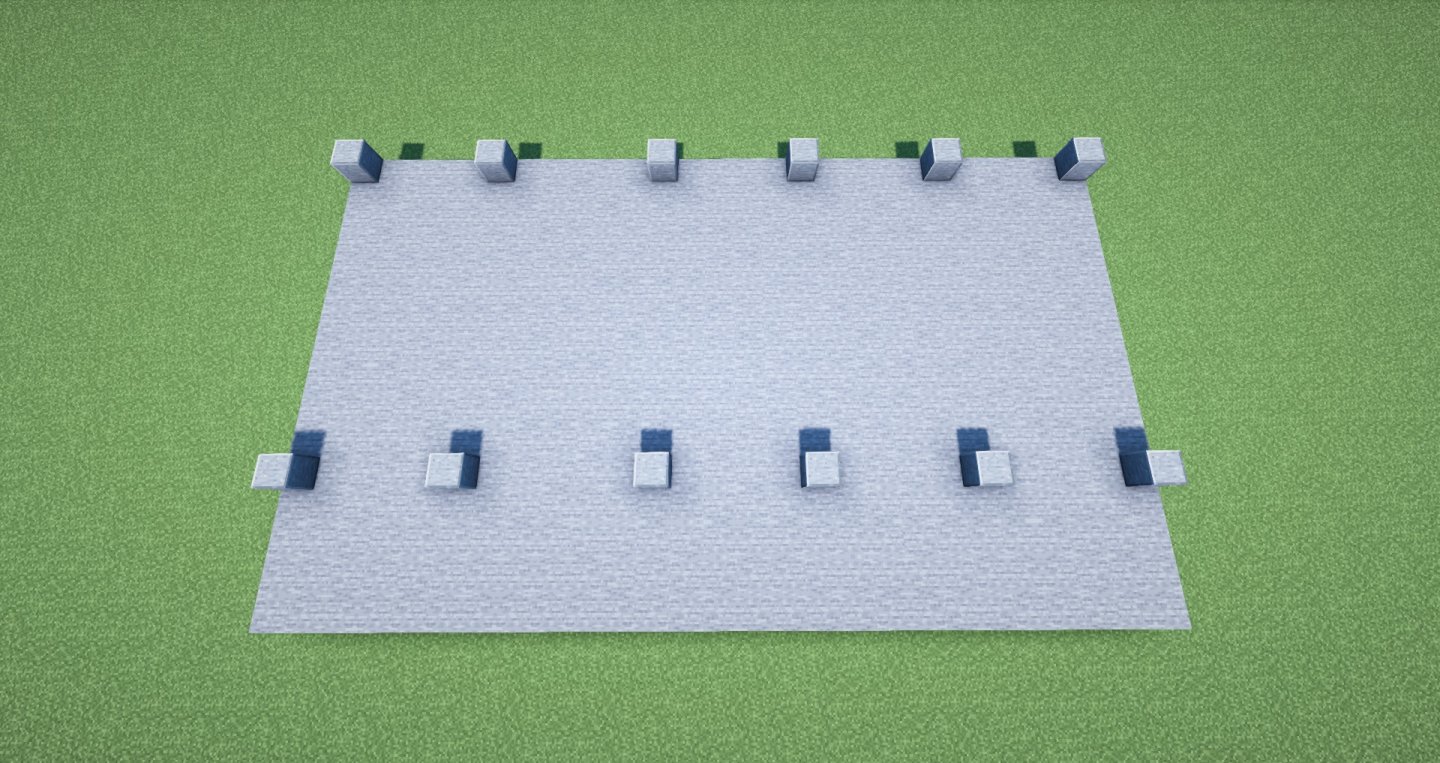 之后用磨制安山岩确定柱的框架位置,中间的五格进深区域用来放大门,四格区域规划窗户。按着这个思路继续填补。