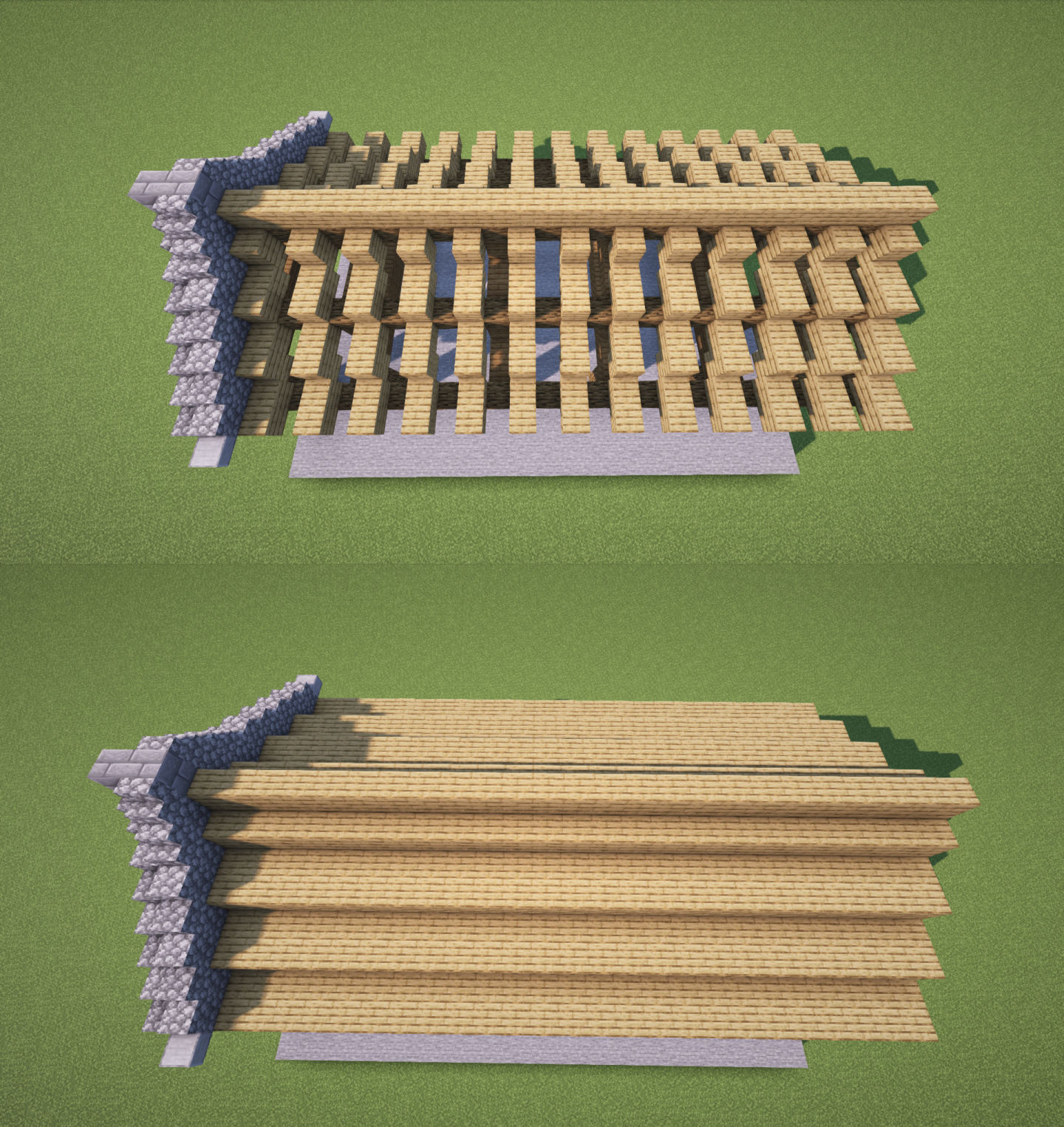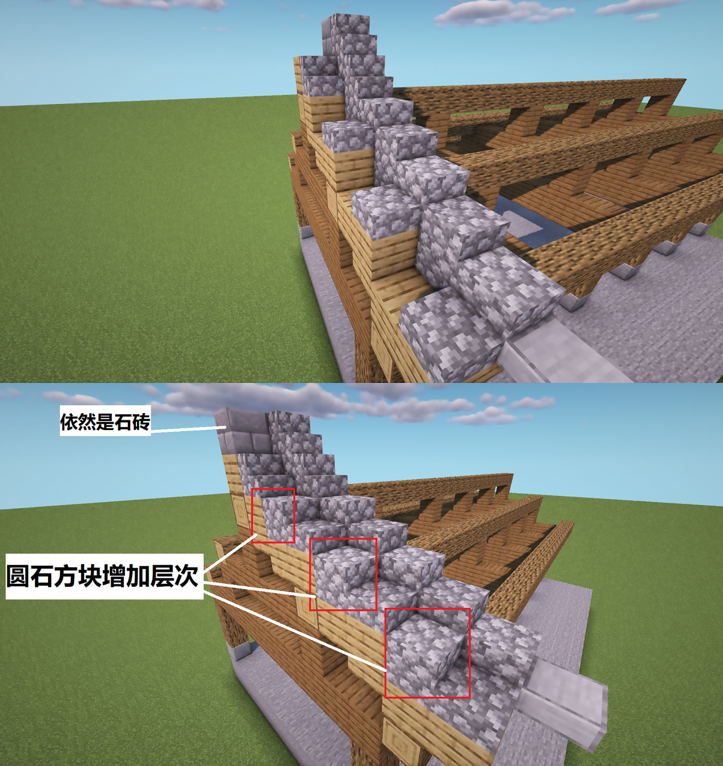 下图,在另一边的椽子上继续铺设瓦片,使用圆石楼梯+圆石方块组合,增加层次的同时让这一边的瓦片趋势变低,这样就能形成屋顶瓦片高低错落的感觉。