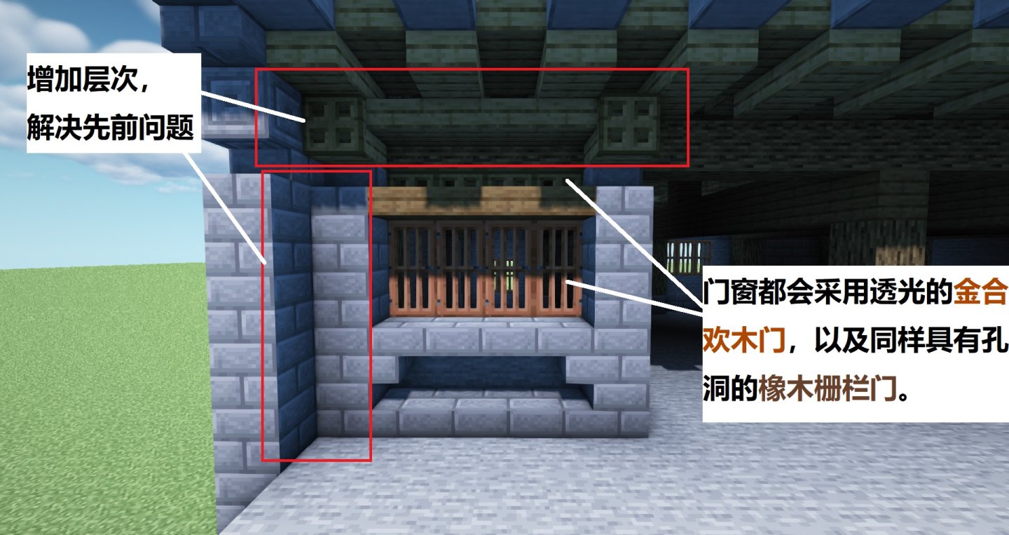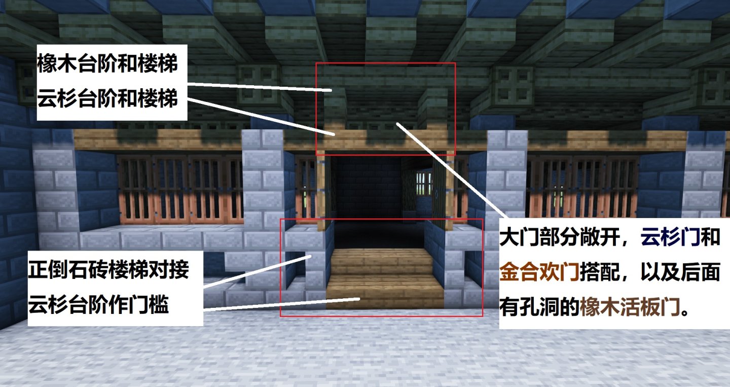 下图,按照风格和色调统一的原则,橡木和云杉木以及石砖部分都是继续同排沿袭,包括檐后的橡木活板门。但唯一区别是大门部位格数较多,上方用橡木楼梯和云杉木楼梯对接,下方用石砖楼梯对接,门窗部分结束。