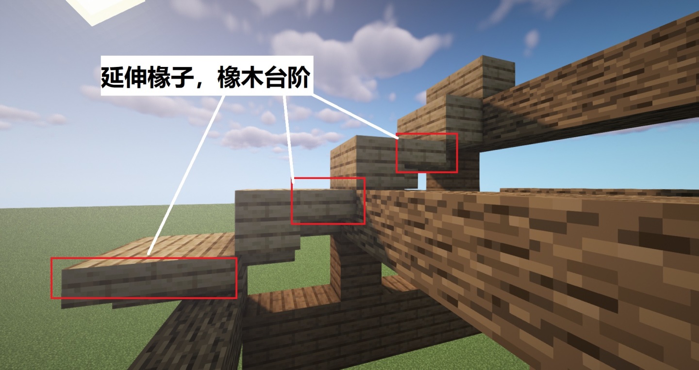 下图,延伸一列,依然是橡木木板搭配半砖,这两排椽子就是一组,进行如法炮制铺满整个屋顶,就能呈现内部房梁高低错落的感觉。