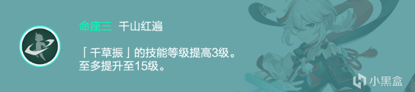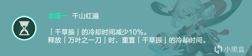 可以更频繁地释放「千草振」,这也意味着更多地触发扩散反应,1命后至少多触发了2次扩散,这一般就直接意味着28000点伤害,性价比较高的命座。