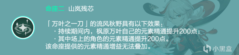 绝对的核心命座。为站场角色和自己提升200点精通,这意味着站场角色的元素反应更加强力,而且万叶的固有天赋多给了8%的元素增伤。还有万叶自身的伤害提高。如果有预算,那就非常值得抽到2命。