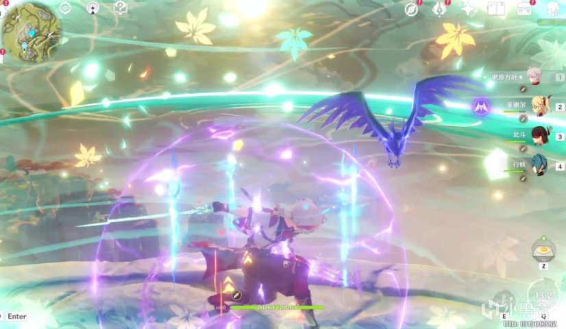 枫原万叶60元素能量放Q,短按E产生3个风微粒,长按4个,都是前台吃到。