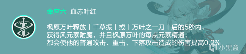 因为万叶的伤害不来自技能倍率而是扩散反应,所以这个命座没有其他角色效果那么好。