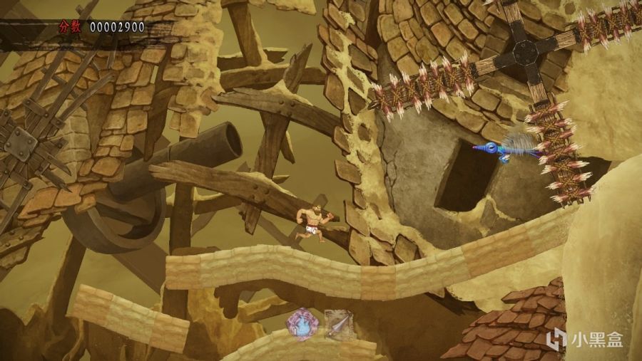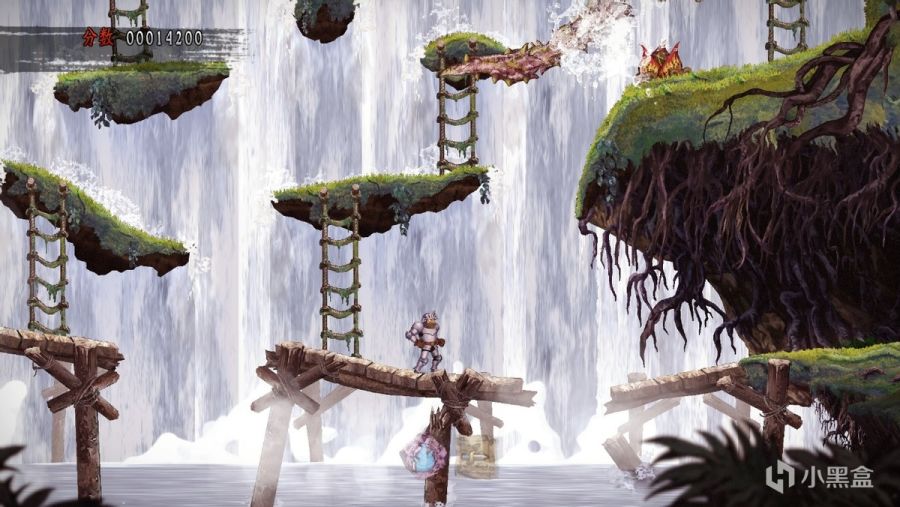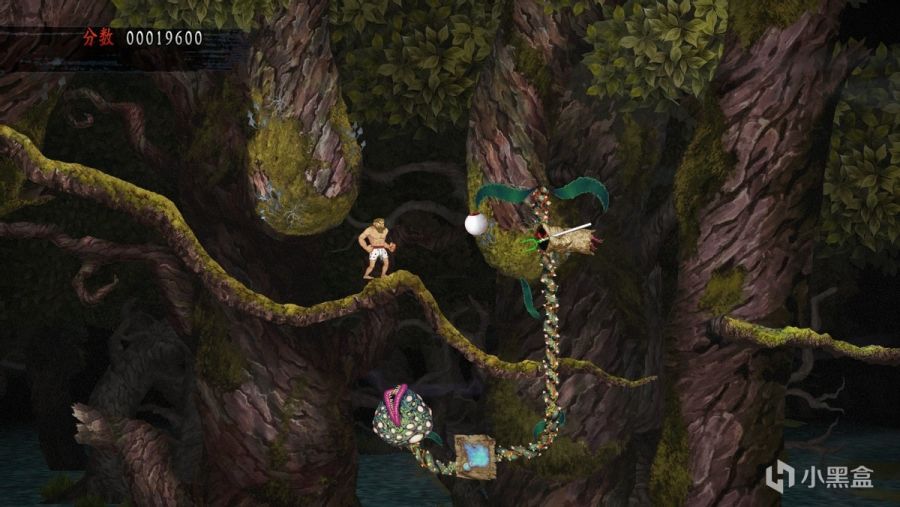 不过,您以为简单难度下死亡后能无限复活就意味着亚瑟无敌了?显然这种观念是大错特错的。比死亡更可怕的是亚瑟一如既往的僵硬跳跃手感,这成为了玩家前进道路上的最大阻碍,没有什么花哨的东西,就是最简单最单纯的按下跳跃键却显得那么难掌握。很多时候明明看着能跳过去的地方却往往需要付出亚瑟好几条生命,这距离就是目测不准确。而亚瑟的硬直更给这份困难“锦上添花”,碰到机关会硬直、被怪打中会硬直,硬直之后亚瑟虽然会进入暂时虚化无敌状态但也有一个要命的向后小小位移,经常在空中不小心挨一下就很凑巧的没跳过去。掉到沟里、掉到水里、掉下悬崖,亚瑟都是直接暴毙,没有任何回旋的余地。