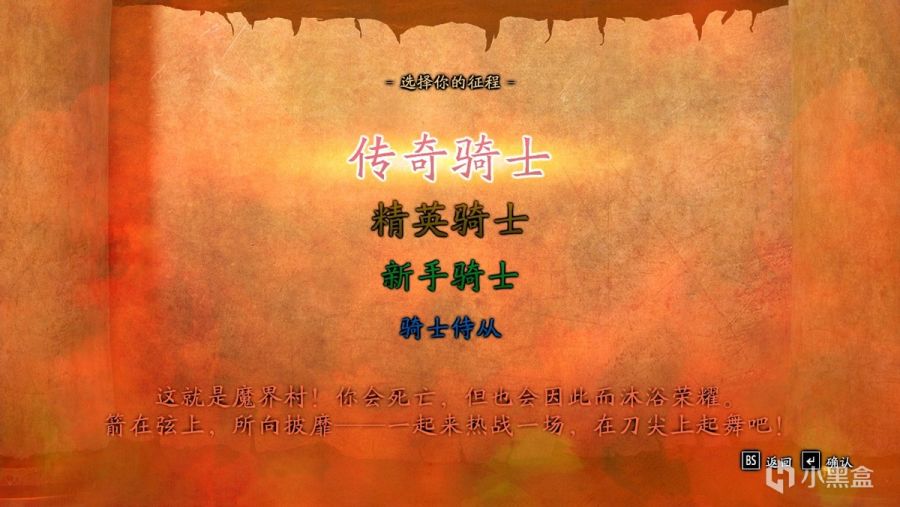 在本作中制作组非常友好的提供了多种难度选择,最简单的是“骑士侍从”级别,在该难度下亚瑟拥有了不死之身,哪里死亡就哪里满状态复活,完全没有任何死亡惩罚,并且亚瑟的盔甲还能抗好几下,大大提高了容错。而最难的是“传奇骑士”级别,就非常有老魔界村那个受苦味儿了,亚瑟挨一下就破甲、挨两下就变骷髅,基本上就需要无伤才能到达下一个旗帜检查点,对玩家要求相当高。因此新手直接毫不犹豫的最简单难度走起,而高玩则可以挑战下自我,直接地狱难度开局先尝试一下,等真的遇到难以克服的挫折后再降低标准,反正最终同样也能够找到自己合适的难度,大家的亚瑟都有光明的未来。