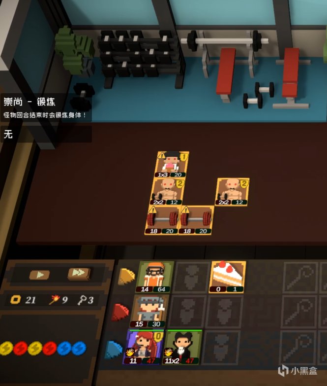 而且,那些肌肉大汉在袭击我们的同时,还会不停地撸铁来暂时提升他们的攻击力,这样没两下攻击力就能破10点以上,非常地恐怖。