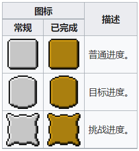 目标进度:必须要完成特定指定的目标的成就,比如要对特定生物发起挑战或者制作和获得指定特殊物品。