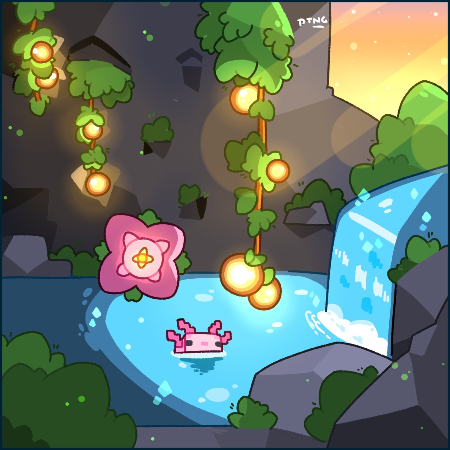 繁茂洞穴里的美西螈和荧光果