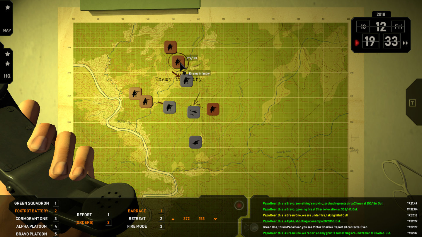 "Radio Commander"作为独立游戏来说质量很高。这款游戏玩法相当独特,不同于兵棋游戏或"英雄连"这种RTS,"无线电指挥官"是一款非实时策略游戏。整个游戏的场景就是个军营帐篷,里面有地图供玩家查看,以及通信设备等。剧情背景是60-70年代的越南战争,玩家扮演美军指挥官(应该是营级),远程指挥部队执行任务。地图是静止的,而越共则神出鬼没,玩家需要通过无线电里传来的信息判断作战情况和敌方动向,并下达指令。与真实作战类似,身处前线的大兵很可能也不确定敌人的位置,也会误报消息。玩家的决策会决定前线士兵的命运。游戏有一定难度。