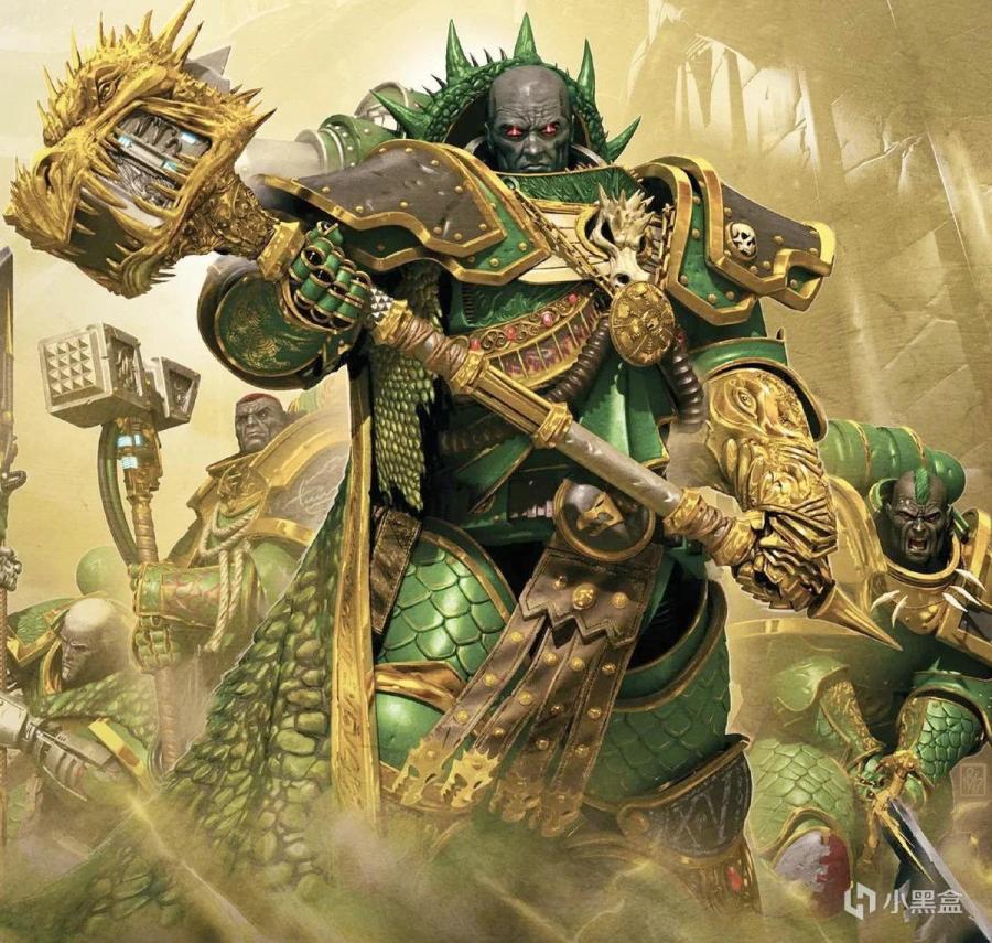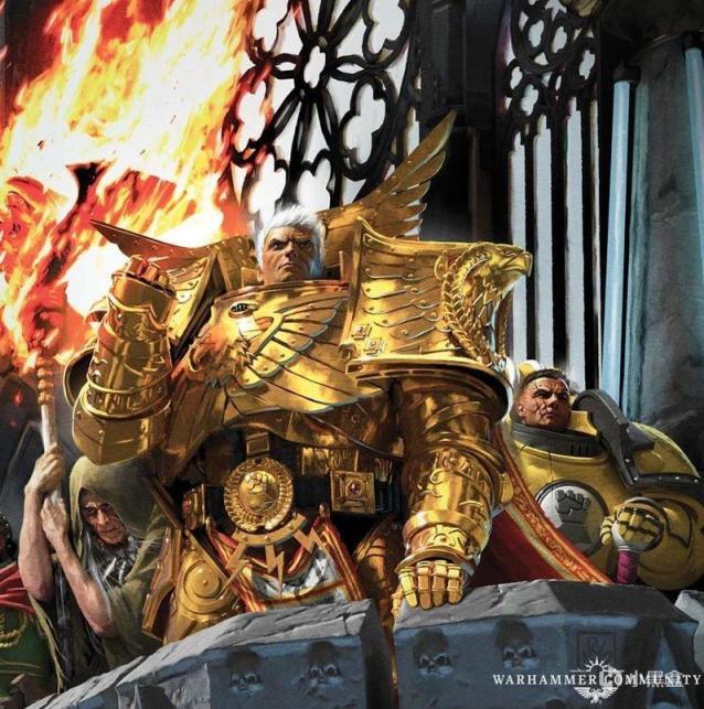 擅长攻城/守城战的地台……哦不,帝国之拳军团基因原体多恩(中),身穿帝皇同款金甲。在GW的官方背景故事里,多恩的子嗣经常沦为伤亡惨重的“渲染悲壮气氛专用工具人”,故帝国之拳军团也被迷友戏称为“地台拳”