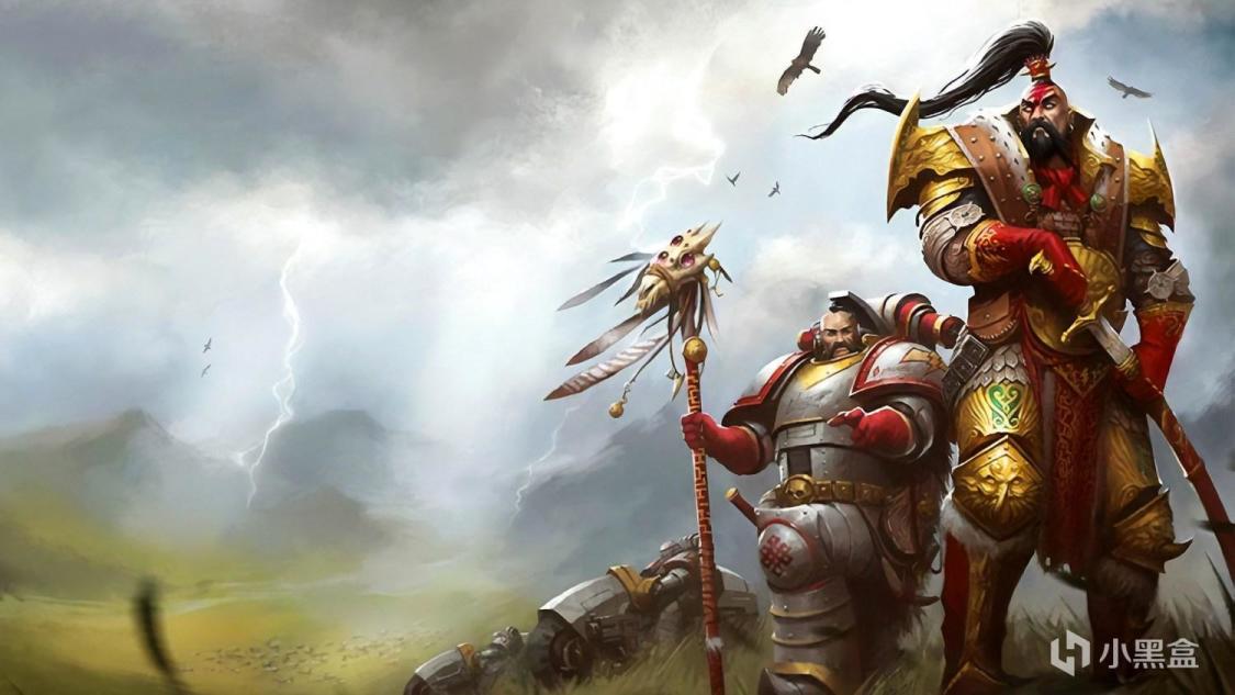 白色伤疤军团基因原体察合台可汗(右一)。可汗是众多原体中唯一一位带有强烈亚洲(蒙古)元素的原体。实际上白色伤疤军团的作战风格类似现实历史中的蒙古铁骑,他们极度推崇闪电战术,并以象征吉祥的盘肠纹(即“中国结”)作为徽饰