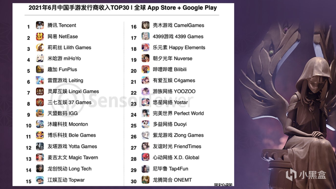 最近Sener Tower公布了6月份的中国手游发行商全球收入排行榜,腾讯、网易、莉莉丝依旧稳健发展瓜分前三,米哈游位居第4名,趣加游戏排名第5名,雷霆游戏凭借发行摩尔庄园异军突起冲入第6名。