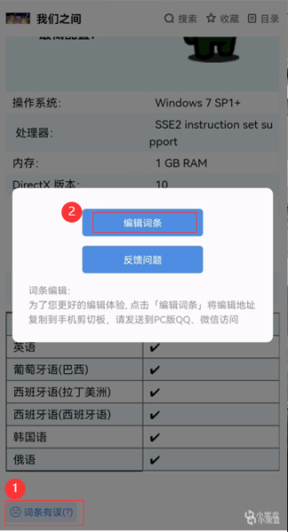 目前《我们之间》百科的所有数据页面都处于开放状态,所有用户可申请编辑。在词条最下方选择词条编辑即可修改某词条数据。更多详细内容可以使用电脑登录 c.xiaoheihe.cn 进行编辑,或在移动端点击词条最下方的编辑词条提交你的修改审核。