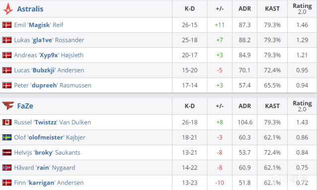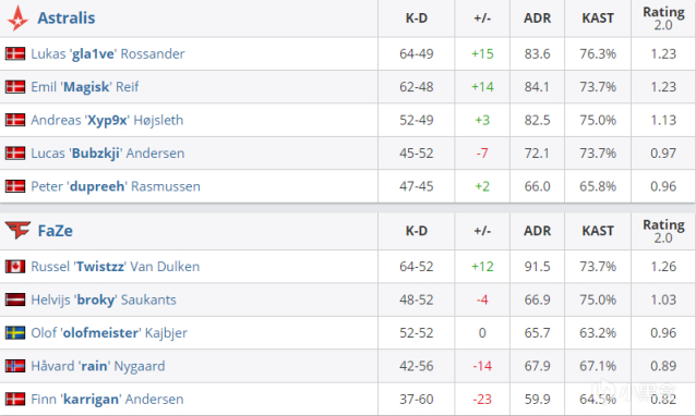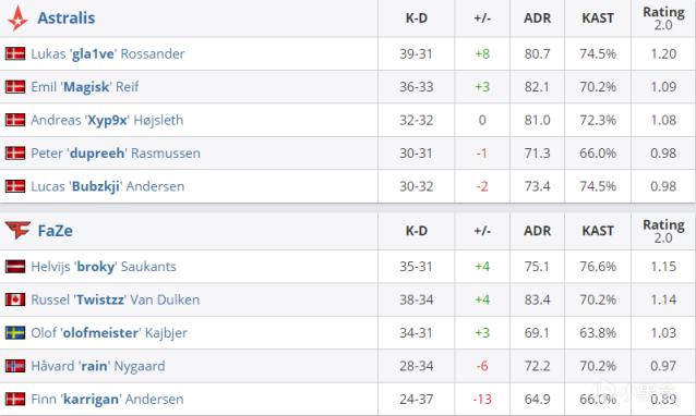 broky一个顶级残局让队伍兴奋了起来,karrigan和Twistzz立马上头,合力五杀拿到赛点,来到CT方的Astralis靠着dupreeh的三杀守住一分,随后glave也疯了,在管道取得三杀,broky在残局想找回场面,但少打多的残局着实没有机会,关键回合,Astralis先用道具断绝了FaZe rush的可能,外场一线烟爆开后FaZe四人走K1,dupreeh先收两个过路费,Bubzkji打掉雷包将时间拖尽,比赛再次加时。