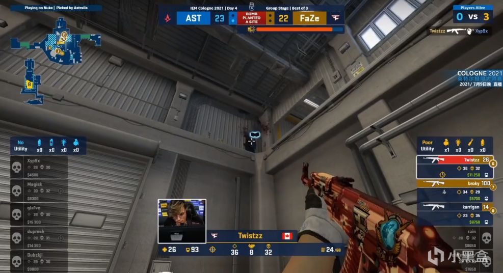 第八回合broky拿到的人数优势被karrigan送回,Twistzz的AK让Astralis在外场寸步难行,挺过了玄学比分,FaZe已经将将优势扩大到了8分,第十一回合Astralis内场爆弹被karrigan双杀劝退,dupreeh找到机会进入B区放下c4,残局时glave抓住FaZe的失误成功双杀拿下回合胜利。