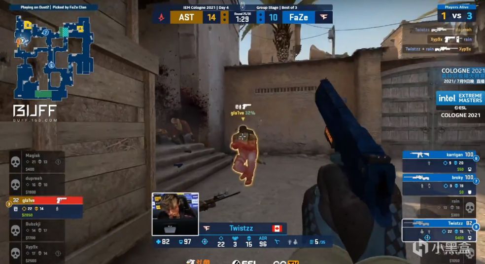 在FaZe的主动选图,并且是优势方的情况下,他们寸步难行,又一次的A小爆弹,FaZe成功进入包点放下c4,但Astralis铁一般的回防让他们找不到机会,在中路断后的Twistzz瞬间来到1v5残局,打掉一人就被补,第十四回合glave单B防守被FaZe嗅到,面对中路的夹击他左右为难,没能产生击杀他就倒下,FaZe再追一分,上半场最后一回合glave前压B1给足压力,队友在其他点位产生击杀弥补了他的白给,3v4残局FaZe走A小,面对重重关卡,他们难以获胜。