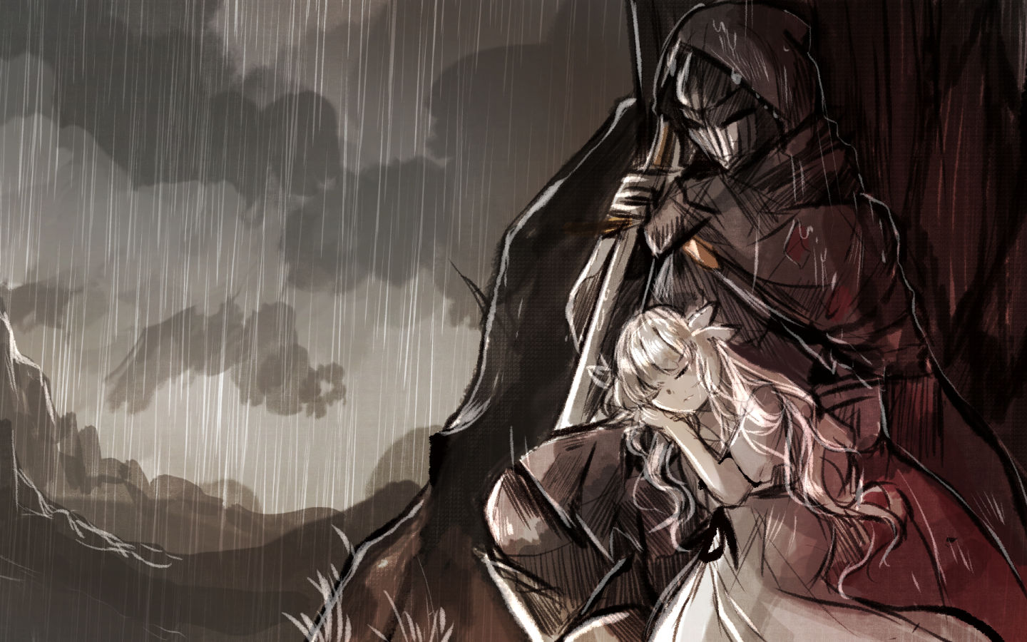 边陲之国面临亡国之患,本该被守护的国民沦为不死的怪物,奋战到底的同胞们也疯了,消失于雨中。艰难地维护着自己衰弱的意识,我来到了王座大殿,我把剑锋对准了自己本该守护的国王。国王身体抖了抖,呻吟道难听的狂言。鞠躬尽瘁,为国家做出种种牺牲的骑士与泉之白巫女不过是无关紧要的炮灰。我看清了令国王疯狂着迷的不死力量所带来的后果,充满着自私及仇恨的言语无疑是国王吐露出来的真相,我也明白的很,因为我体内也流着相同的王族血统。我也一样,一切都是为了自己而不是因为想要捍卫国土,我只不过是想逼他承认抛弃我,是他的愚昧,有眼无珠。当我把剑锋对准他时,他那充满恐惧的眼里映着我的面孔,终于逼他正视我,我等这等好久了。