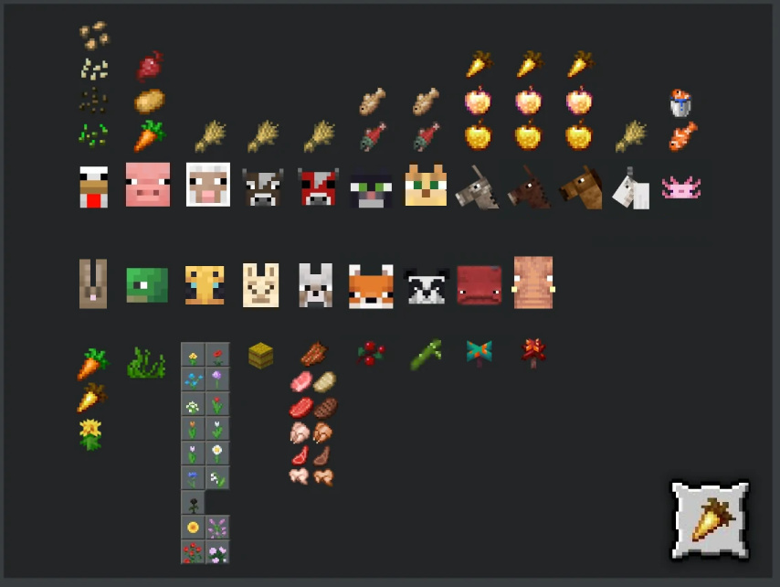 即与Minecraft农业和牧业相关的成就,涉及到耕种、垂钓、繁殖、动物交互等内容,需要接触到Minecraft原版中的食物、动物、植物等内容。共18个成就。