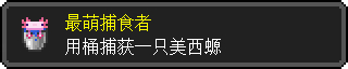 美西螈经由玩家在鱼桶里放出来后,会和玩家一起击杀敌对生物,玩家击杀与美西螈战斗的溺尸、守卫者或远古守卫者后,会获得随机时长的生命恢复I并移除挖掘疲劳状态效果,此时该成就完成。