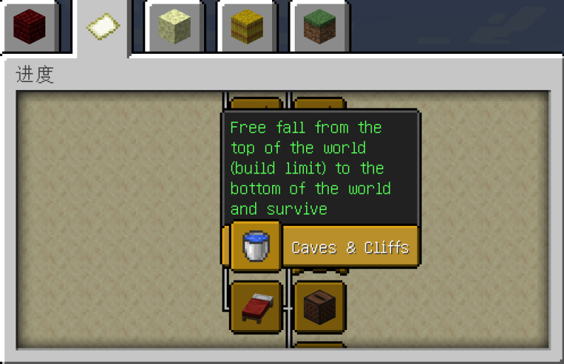 从该成就进度的图标里看出是水桶,可以理解到由于1.17和1.18的更新主题是“洞穴与山崖”,主世界的高度上下限Y坐标为-64到319。也就是说要玩家从y=320的高度直接掉到最底部y=-64,高空掉落借助水桶或水源能够让自己存活。忆塘愿称之为:超级落地水!
