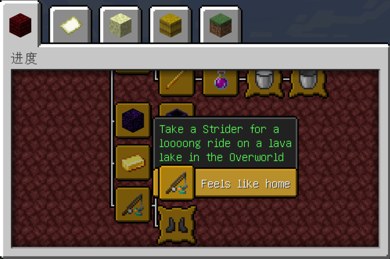 [温暖如家](Feels like home):在主世界中骑乘炽足兽在岩浆中走过50个方块