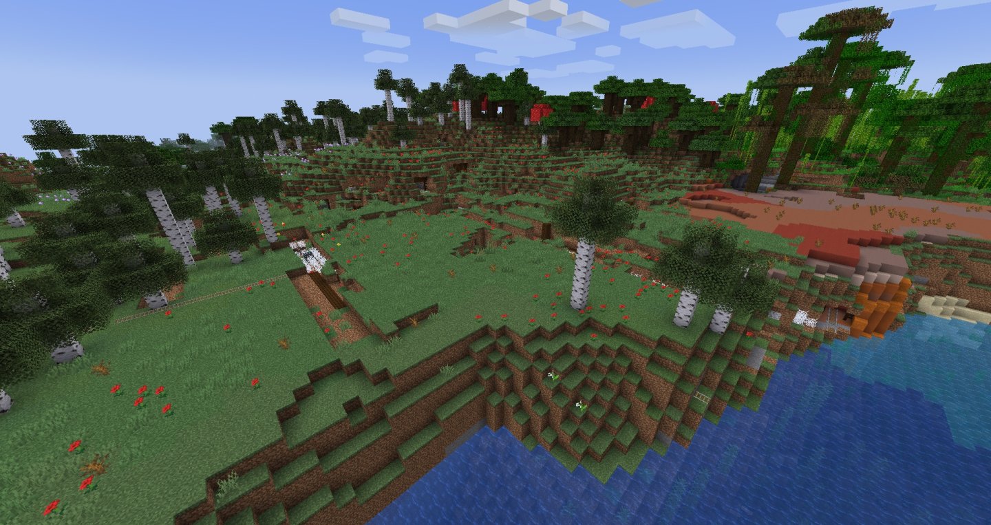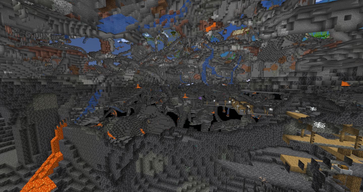 但其实,主世界洞穴蜿蜒曲折、峡谷纵深程度较大,地面上不妨也有高耸山峰和崎岖山脉(虽然最近快照都优化了很多),一般肯定是需要玩家手动制造一个上天入地(上下383格畅通无阻)的条件吧!