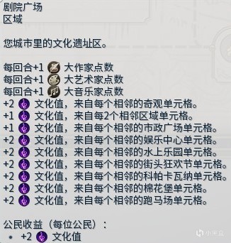 尽管目前的剧院区并不是很强,但无论如何文化是游戏中最重要的资源之一,包括一些建筑(如纪念碑)、著作与宗教信条都可以补充适量的文化。更高的文化能让你有更先进的政体、更强的政策卡,也能使你城市扩格子的速度变快。